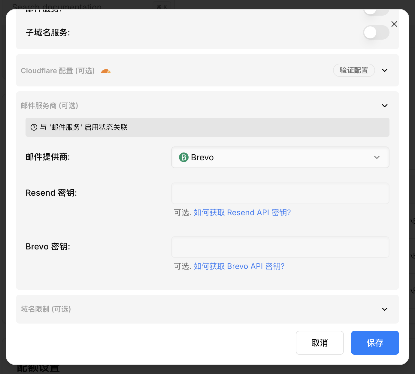 Note: The BREVO_API_KEY configured here is used by default for the subdomain application notification feature and is not used for sending emails directly. You can also fill this key in the domain configuration below as the sender for the email service module.